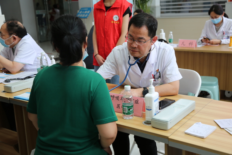 活动现场聚集了许多来健康咨询的居民,专科医生仔细查看了他们的病历单和诊断报告单,耐心倾听居民诉求,并为其进行健康检查,提供了相应的治疗方案和用药指导。