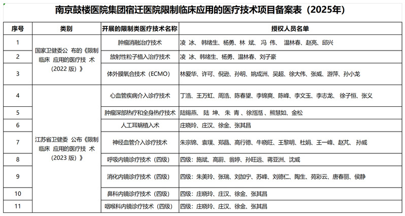 南京鼓楼医院集团宿迁医院限制临床应用的医疗技术项目备案表(2025年)